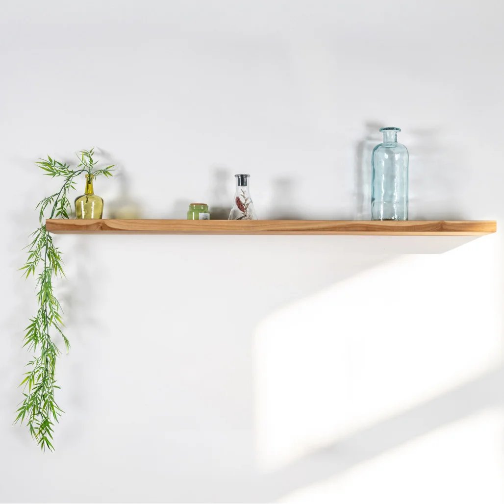 Elegante y funcional, la estantería mural Helvine de teca maciza realza tu interior gracias a la nobleza de su madera natural.