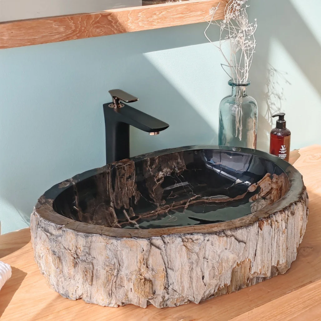 Lavabo de cuarto de baño de madera petrificada fosilizada negro