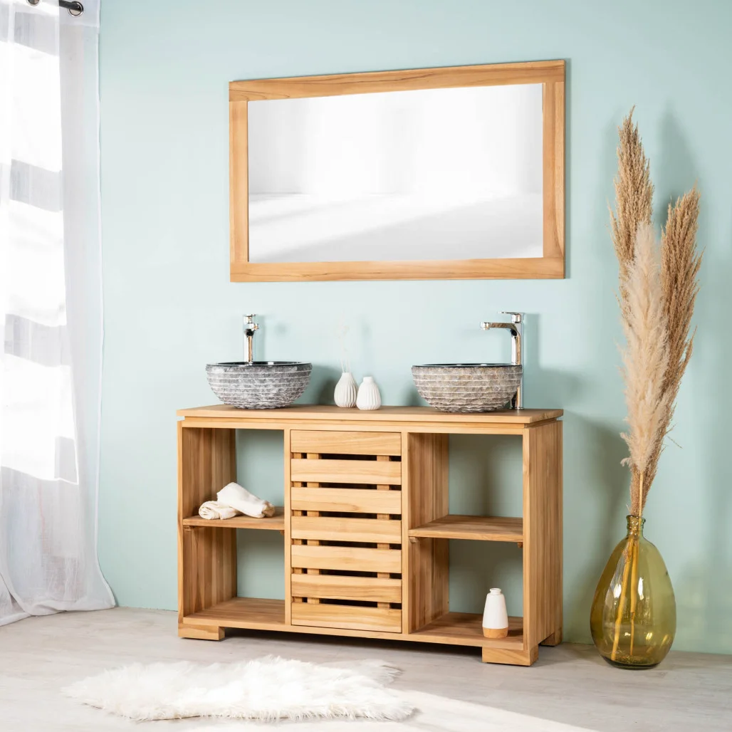 Cree una atmósfera zen y tranquila en el cuarto de baño con este mueble de madera maciza de teca .