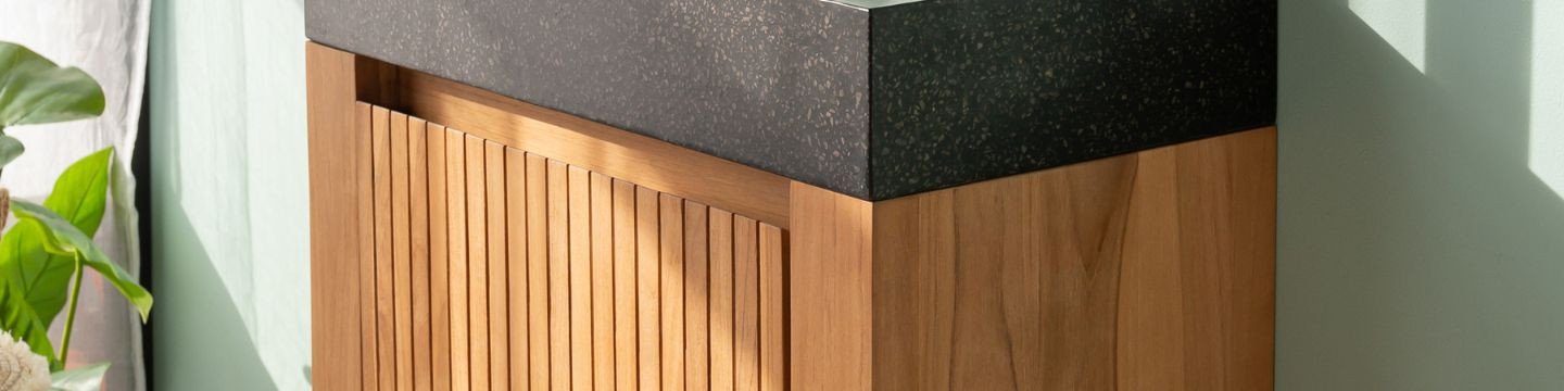 La colección Luxe hace honor a su nombre: combina la elegancia natural de la teca maciza con lavabos de terrazo para crear un baño cálido y sofisticado. La gama se articula en dos longitudes clave: un lavamanos suspendido de 60 cm, perfecto para un aseo o un espacio reducido, y un mueble de 140 cm para quienes buscan una composición más amplia.